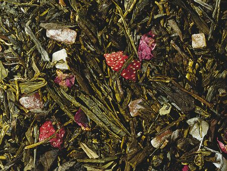 Zutaten: grüner Tee (76%) (Sencha und Lung Ching), weißer Tee ( 10%) Pai Mu Tan, Papayawürfel ( papaya, zucker), Ananaswürfel (Ananas, Zucker), Aroma, Rosenblüten, gefriergetrocknete Erdbeerstücke